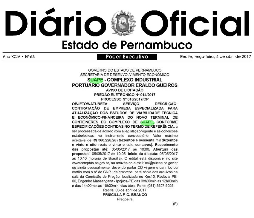 On April 4, 2017, Suape's administrative board released a bidding notice to upgrade Container Terminal 2 Technical and Economic Feasibility Studies (EVTEF). The winner of the bid shall have 90 days, extendable for an equal period of time, after the signing of the Authorization of Services to present such studies. The terms of reference and the bidding notice are available at www.compras.pe.gov.br. The studies will be developed in partnership with the Planning and Logistics Company (EPL), linked to the Federal Government's Partnership and Investment Program (PPI).. The winning bidder will have 90 days, extendable for an equal period of time, after the signing of the Service Authorization Order, to deliver the studies. The terms of reference and the public notice are available at the link www.compras.pe.gov.br. The studies will be developed in partnership with EPL (Logistics and Planning Enterprise), linked to the Federal Government's Partnerships and Investments Program (PPI).